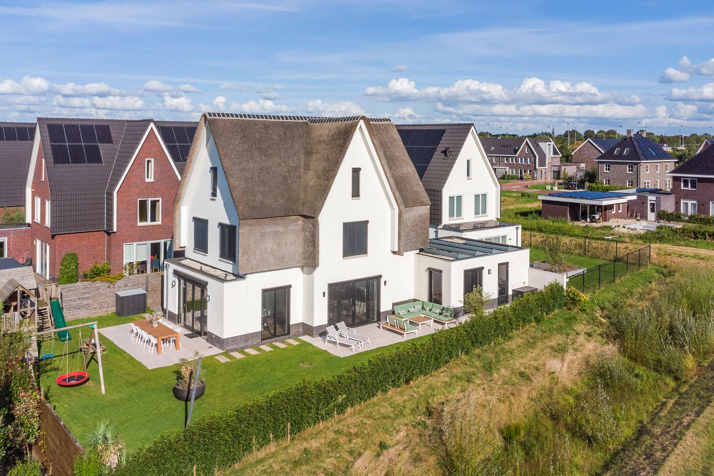Deze fantastisch gelegen, rietgedekte villa met 6 slaapkamers en een hoog afwerkingsniveau ligt aan een doodlopende en daarmee kindvriendelijke woonstraat in de Ewijkse nieuwbouwwijk 't Hof van Campe.