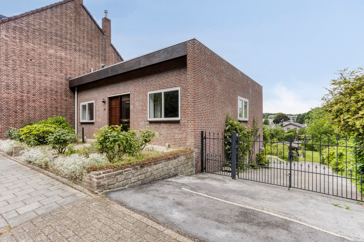 Voortuin met inrit naar ondergelegen achtertuin en garage.