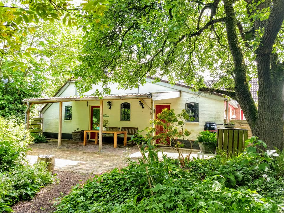 De tuin van deze woning is een ware groene oase van maar liefst meer dan 1300m2. De natuurlijke tuin is oorspronkelijk aangelegd in de jaren '70 en is rijk aan rust, ruimte, prachtige beplanting en diverse zitplekjes. Aan de achterkant van de woonboerderij bevindt zich een brede overkapping en een grote vijver. Achterin een ruim grasveldje met een schommel en een grote, knus schuurtje met een sauna. Vooral in de lente lente is de tuin een beeldschoon paradijs om te aanschouwen.