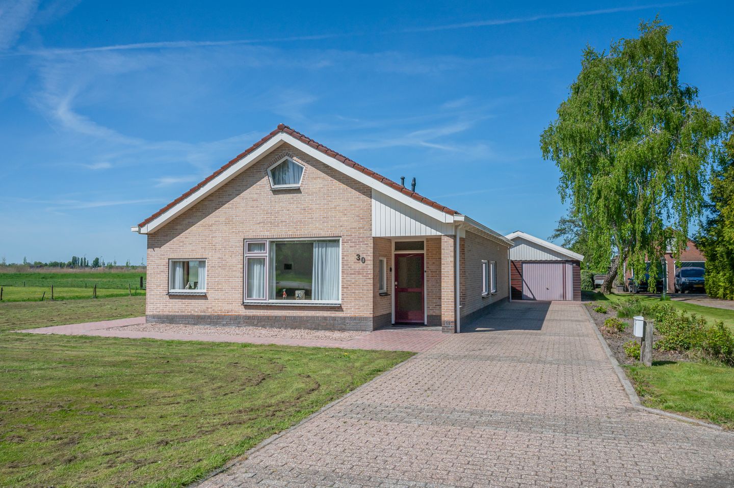 Aan de rechterzijde leidt een oprit naar de grote vrijstaande houten garage (ca. 50m) met doorgang naar twee ruime paardenstallen met zadelruimte. Aan de achterzijde van de woning is een groot terras gelegen met uitzicht over de weilanden die grenzen aan de Blauwestad en het Oldambtmeer.