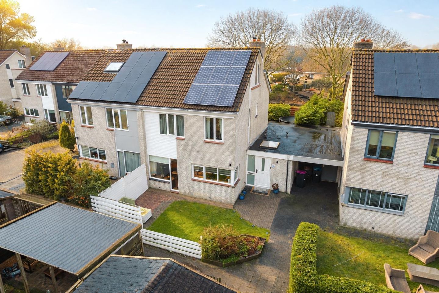 Veel ruimte en een uitstekend label! Op een rustige en zeer kindvriendelijke plek aan de rand van het Sexbierumerplan ligt deze royale geschakelde twee-onder-een-kapwoning met een losse garagebox. De woning beschikt over een diepe achtertuin op het westen, compleet met achterom en overkapping, een fijne plek om tot in de avond van de zon te genieten. Aan de voorzijde ligt een speeltuintje, terwijl de achterzijde juist mooi vrij gelegen is. Daarnaast is de woning uitstekend verduurzaamd met 15 zonnepanelen, een zuinige pelletkachel en een elektrische boiler voor energieopslag! Dit alles resulteert in een energielabel A: hier kun je comfortabel wonen! Begane grond: Via de overdekte entree kom je binnen in de ruime hal met het toilet, de meterkast en een praktische garderobekast. Op de begane grond vind je bovendien een extra badkamer met een heerlijk whirlpool bad, vloerverwarming en een wastafelmeubel. De royale bijkeuken (voormalige berging) is voorzien van de witgoedaansluitingen en een achter entree, Deze ruimte zou ook als slaapkamer verbouwd worden in het kader van levensloopbestendig in combinatie met de badkamer op de begane grond. De ruime tuingerichte living is een fijne plek om te ontspannen, met een pelletkachel voor extra sfeer en openslaande deuren naar de zonnige achtertuin. Aan de voorzijde van de woning ligt de luxe open keuken (NOLTE 2020), compleet uitgerust met o.a. een 6-pits SMEG fornuis met grote oven, Quooker, vaatwasser en een koel-vriescombinatie. 1e verdieping: Op de verdieping bevinden zich drie fijne slaapkamers. De royale ouderslaapkamer aan de achterzijde is circa 18 m² groot en aan de voorzijde nog twee ruime slaapkamers. In het midden ligt de luxe badkamer, voorzien van vloerverwarming, een inloopdouche, het tweede toilet en een wastafelmeubel met verwarmde spiegel. 2e verdieping: Via de vaste trap bereik je de zolderverdieping met een overloop die toegang geeft tot de zolderberging, hier de cv-ketel en de elektrische boiler. Daarnaast vind je hier een mooie vierde slaapkamer met een flinke nokhoogte. Ook goed in te richten als werk- of hobbykamer. Goed om te weten: - Extra ruimte op de begane grond dankzij de omgebouwde berging - Vrije ligging aan de achterzijde, geen directe achterburen - Goed onderhouden woning, vrijwel volledig voorzien van dubbele beglazing - Op het plein nog een extra garagebox en een houten tuinberging in de achtertuin