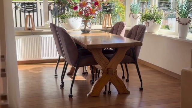 De keuken ligt praktisch in verbinding met de woonkamer en biedt daarnaast ruimte voor een eettafel. Een fijne plek om de dag rustig te beginnen met een kop koffie en een ontbijt, terwijl het huis langzaam op gang komt.