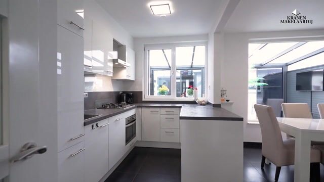 Moderne open keuken, in U-opstelling, voorzien van diverse onder- en bovenkasten en inbouwapparatuur, t.w.: gaskookplaat, afzuigkap, combi-oven, vaatwasser en koelkast. Tevens bevindt zich in de keuken een royale provisiekast.
