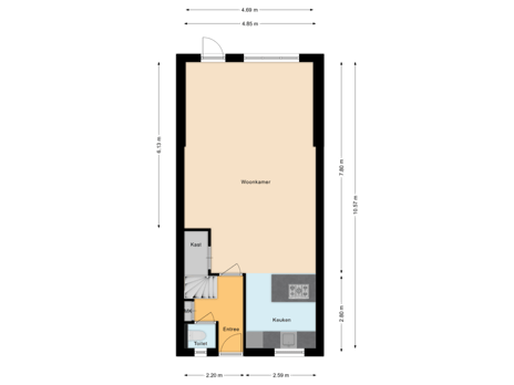 - 49 m² (9,75 meter diep en 5,06 meter breed)