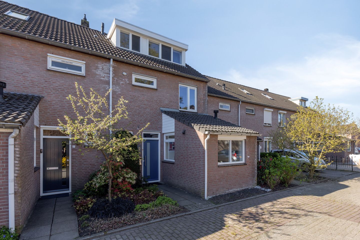 Aangelegde tuin met gazon en terras. Berging met elektra en een achterom. Met zonneluifel en vaste beplanting. Een verzorgde buitenruimte die past bij de woning.