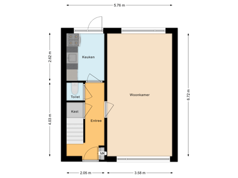 Een lichte hal met een plavuizen vloer. Hier bevindt zich de trapopgang, een provisieruimte, toiletruimte en meterkast (4 groepen). Vanuit de hal is de woonkamer en de keuken te bereiken.