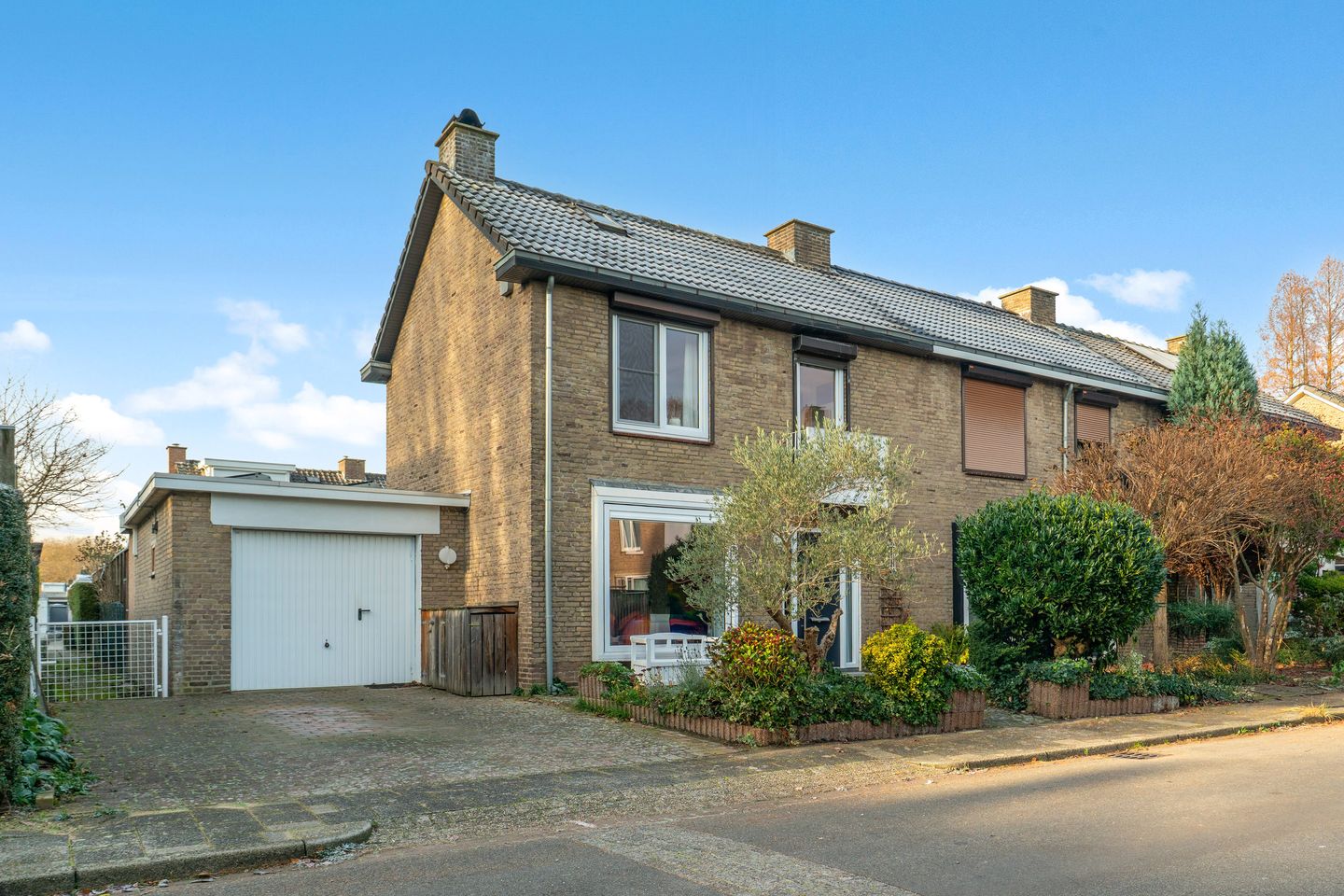 Buiten vindt u een verzorgde voortuin met groen en een betegeld pad naar de voordeur. De oprit biedt plaats aan een garage, ideaal voor uw auto of extra bergruimte.