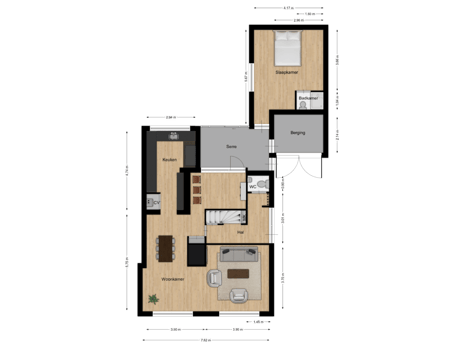 34 m² (5,37 meter diep en 6,40 meter breed)