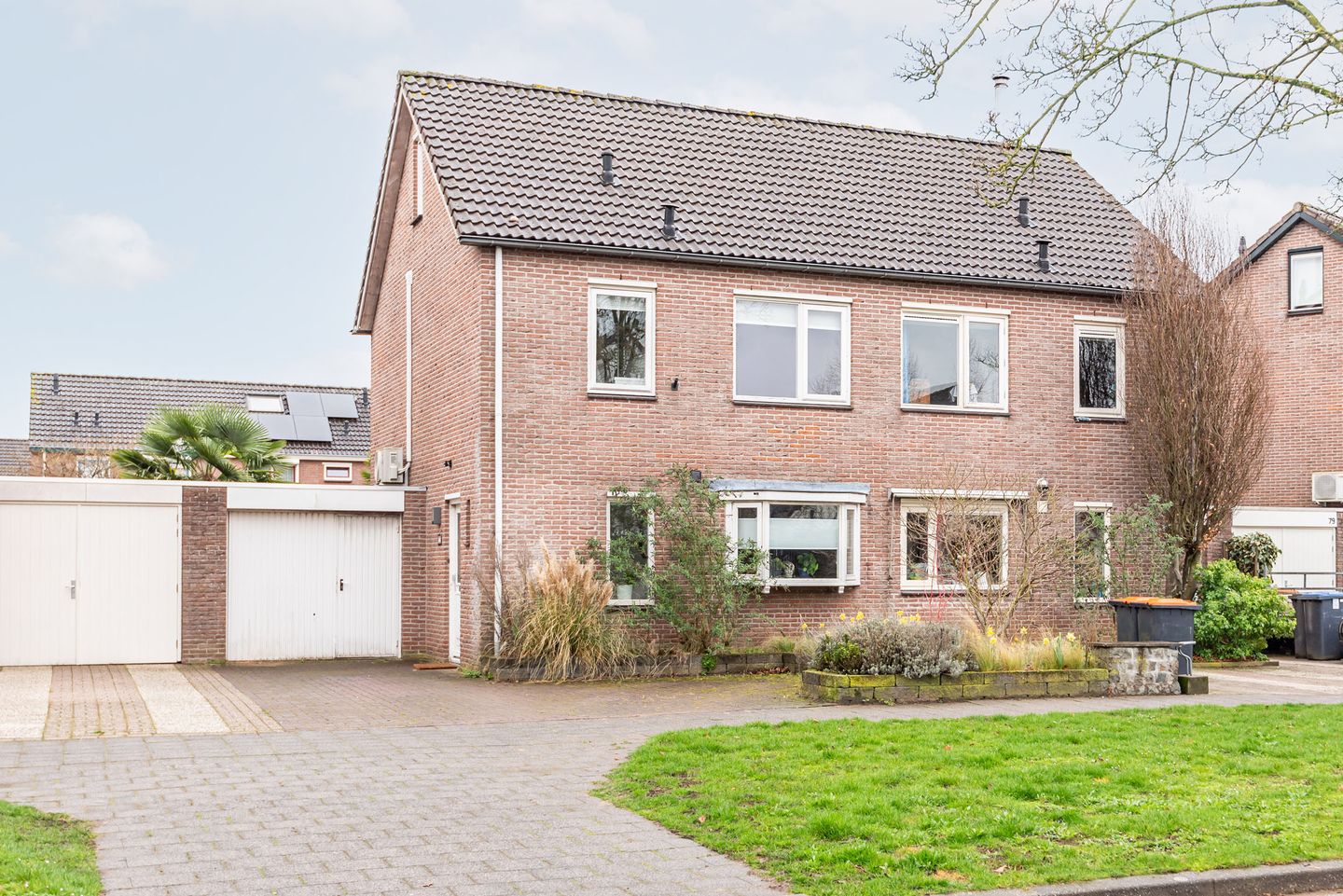 De woning beschikt over een nette voortuin met groen en een lange oprit met plaats voor zeker twee auto’s. De voordeur bevindt zich in de zijgevel, wat zorgt voor extra privacy en een praktische entree.