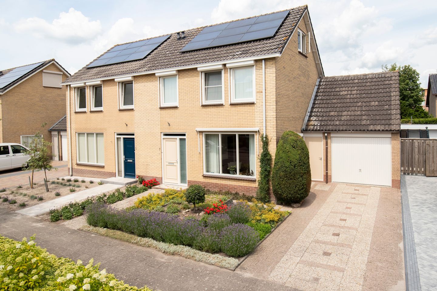 De eerste indruk is direct goed: een brede, verzorgde voortuin met groen en een oprit waar je met gemak meerdere auto’s kunt parkeren.