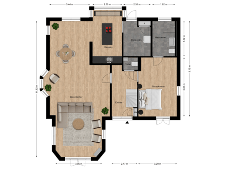 Begane grond: Ruime entree met vide, lichte woonkamer, halfopen keuken, bijkeuken, slaapkamer met en-suite badkamer en separaat toilet.