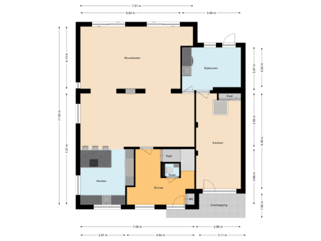 Vanuit de woonkamer is de bijkeuken via een loopdeur bereikbaar. De bijkeuken is voorzien van dezelfde tegelvloer en een extra keukenblokje met spoelbak. Hier bevinden zich de aansluitpunten voor de was- en droogapparatuur. Verder beschikt de ruimte over een kastenwand en een loopdeur naar de achtertuin. Vanuit de bijkeuken is de kantoorruimte toegankelijk.