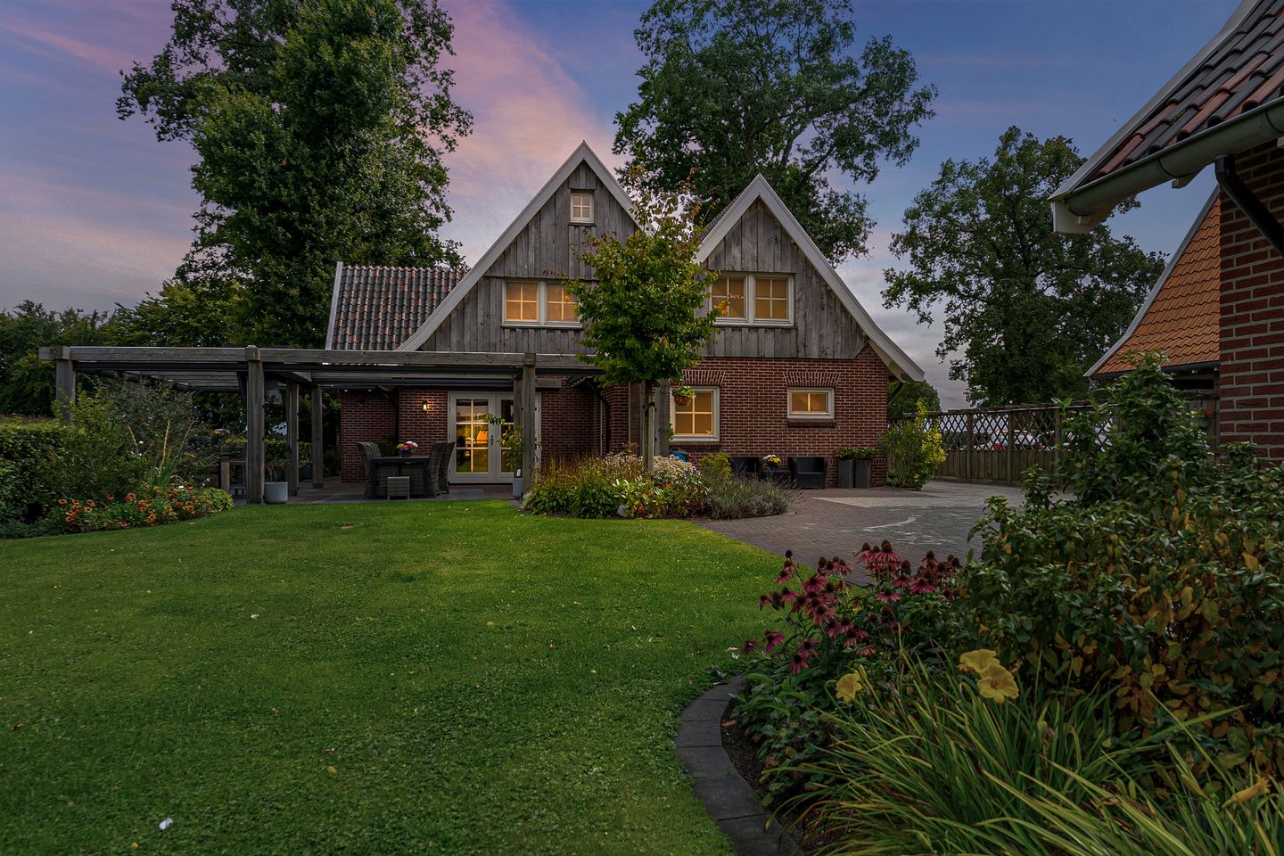 De tuin rondom de villa is met evenveel zorg en liefde aangelegd als het interieur. Hier vind je een vijver, een gazon, kleurrijke borders, volwassen bomen en struiken en diverse sfeervolle zitjes. Dankzij de schuifbare schaduwdoeken op het terras kun je hier het hele jaar door comfortabel buiten zitten, ongeacht het weer. Voor dierenliefhebbers is er bovendien een weide waar nu geitjes lopen, een charmant detail dat bijdraagt aan de landelijke beleving.