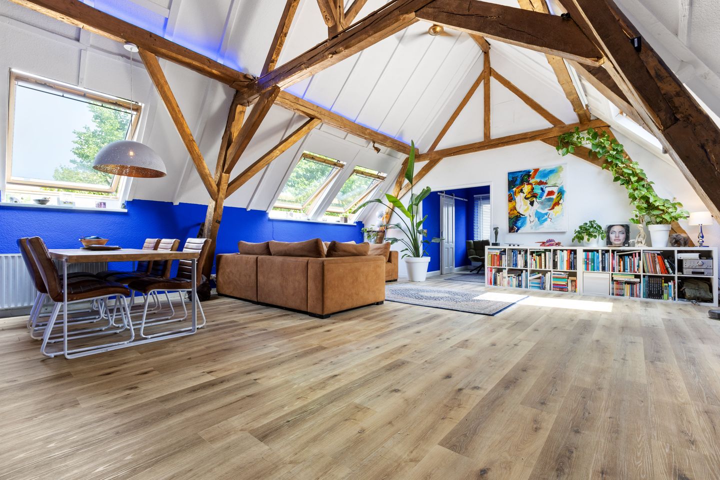 Via het trappenhuis bereikt u de woning. U komt binnen in de ruime, lichte woonkamer met open plafond en zichtbare houten balken. De hoge plafonds geven de ruimte een luchtig gevoel en versterken het sfeervolle karakter. Dankzij meerdere raampartijen is het hier aangenaam licht.