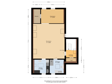 Aan de woonkamer grenst de royale slaapkamer met toegang tot een extra berging, die is omgebouwd tot een praktische inloopkast. Op de overloop bij de ingang bevindt zich nog een extra bergruimte, ideaal voor voorraad of opslag.
