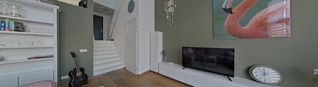 Prachtige royale woonkamer welke zich kenmerkt door hoge plafonds, enorme raampartijen die zorgen voor veel lichtinval en de sfeervolle gashaard met mooie natuurstenen schouw.