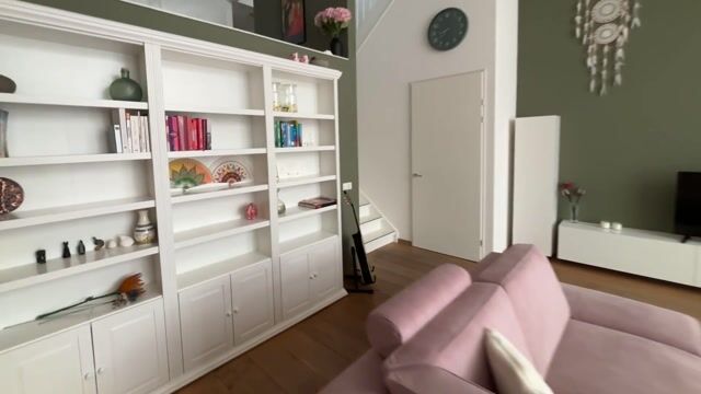 De royale woonkamer verwelkomt je met hoge plafonds (4 m), grote raampartijen die het daglicht naar binnen laten stromen, en een sfeervolle gashaard met natuurstenen schouw—een heerlijke plek om te ontspannen na een drukke dag.