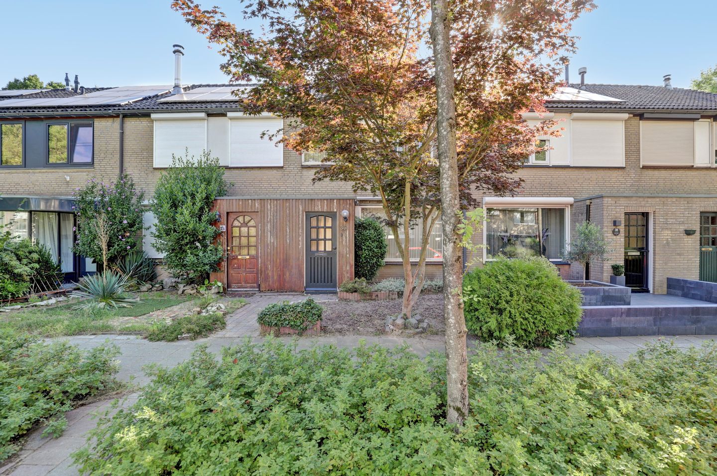 De voortuin met sierbeplanting en bestrating geeft toegang tot de entree.
