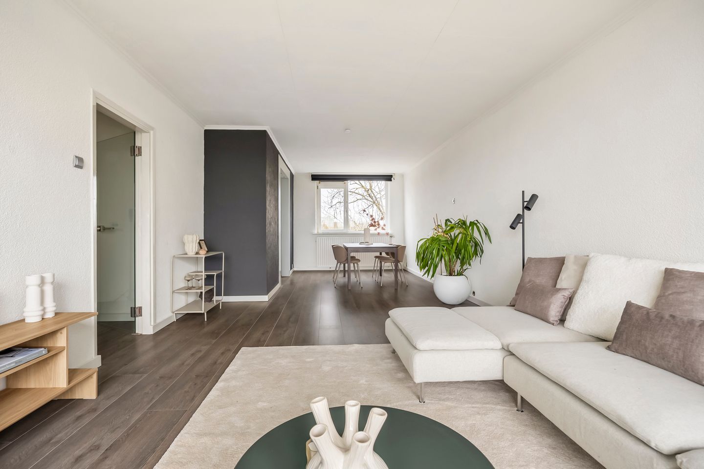Via de glasdeur vanuit de hal stap je binnen in de woonkamer (32,5 m²), waar direct een warme en uitnodigende sfeer voelbaar is. De lichte wanden en nette laminaatvloer zorgen voor een frisse, open uitstraling. Er is volop ruimte voor een gezellige eethoek en een comfortabele zithoek: perfect voor ontspannen avonden in “Netflix-modus”.