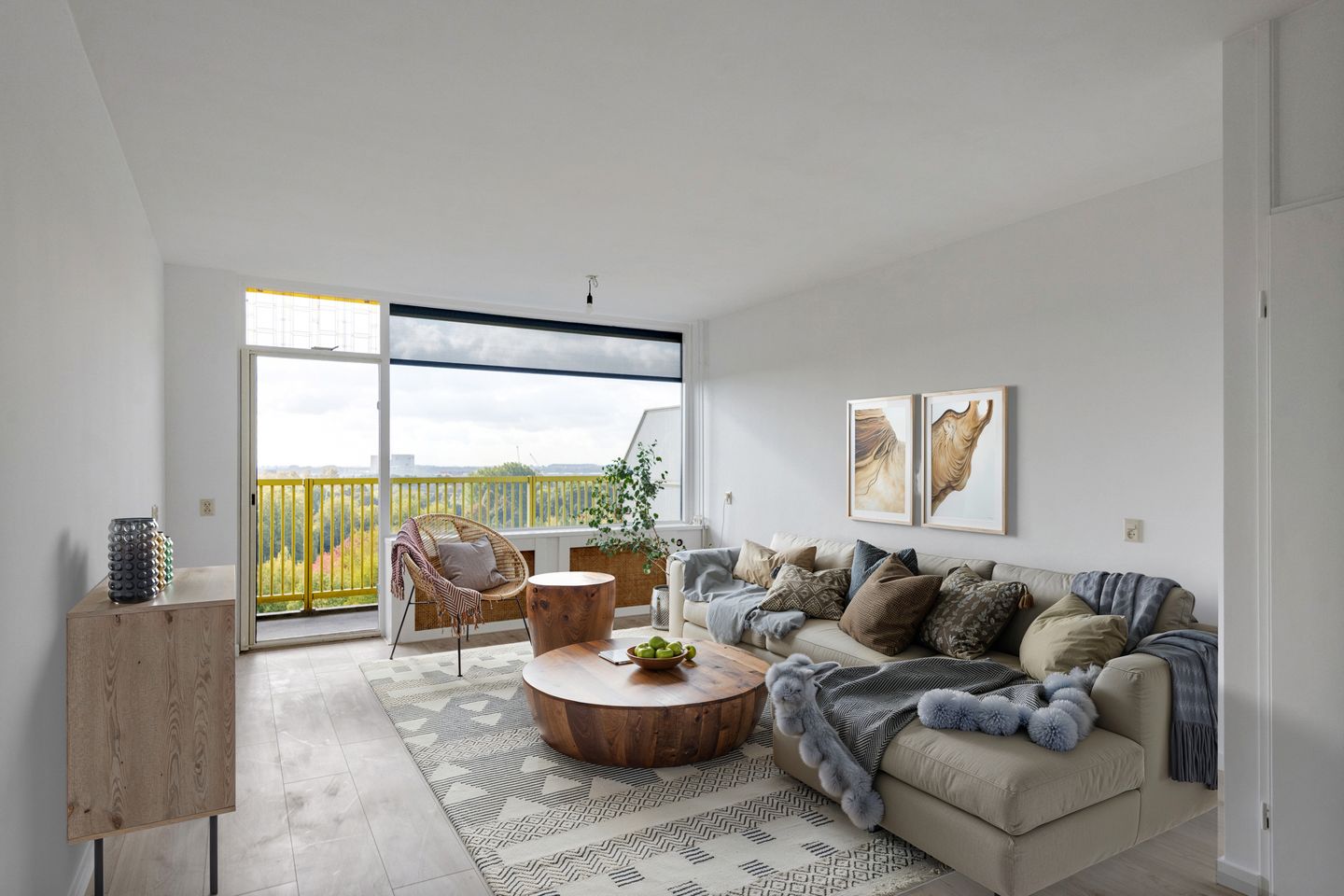 De royale woonkamer is opvallend licht dankzij het grote raam aan de balkonzijde. Vanuit hier stap je zó het zonnige, zuidgerichte balkon op – en wat een uitzicht! Hier zit je letterlijk in de wolken. De fraaie vloerafwerking en de strak gestucte wanden geven het appartement een moderne, frisse uitstraling. Bovendien is er een praktische trapkast aanwezig, ideaal voor het opbergen van spullen. Spullen neerzetten en wonen maar!
