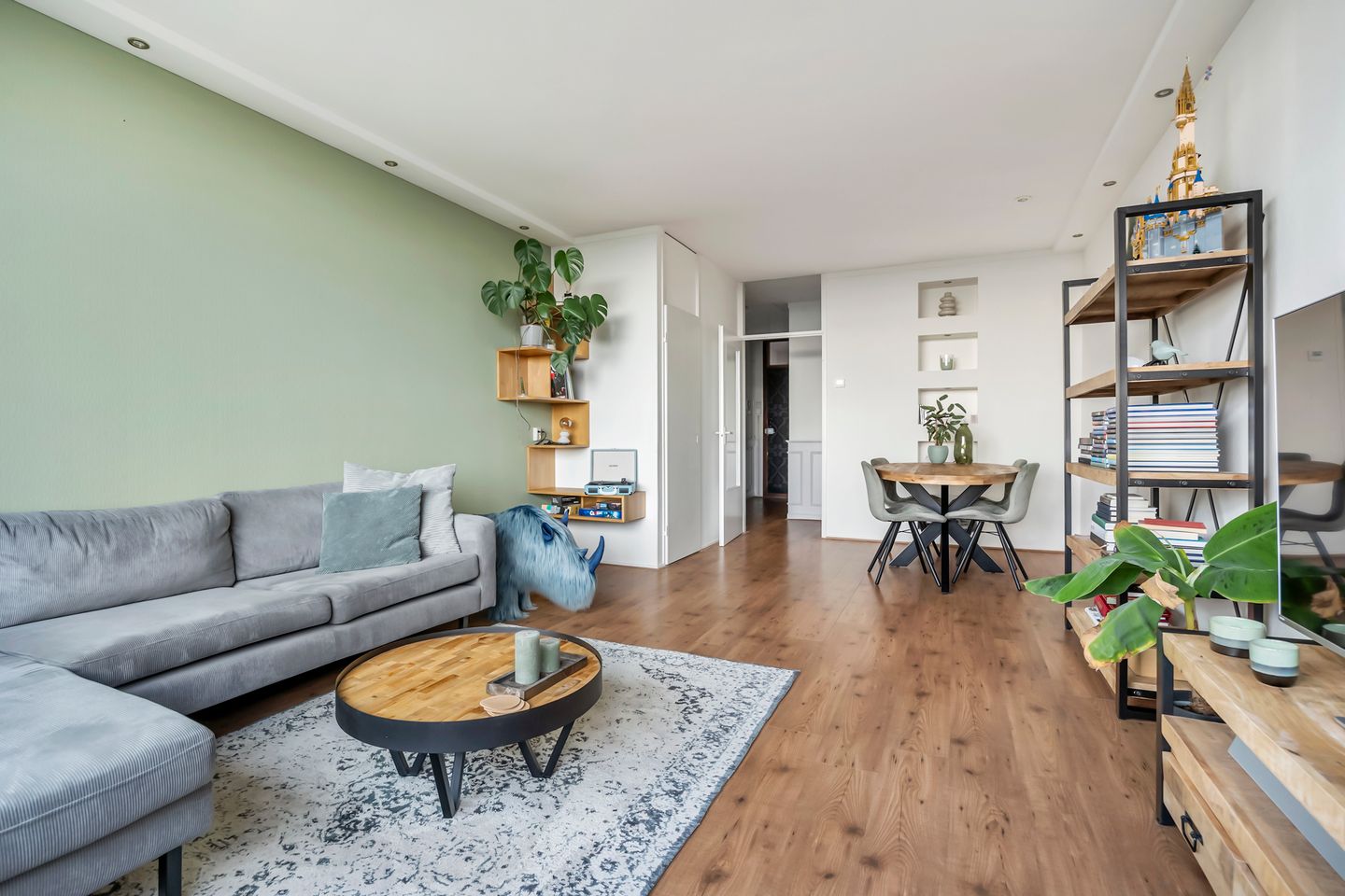 Bij binnenkomst in de hal heb je toegang tot de meterkast, de keuken, het moderne zwevende toilet met fonteintje, en de sfeervolle woonkamer. Deze verdieping is afgewerkt met een praktische laminaatvloer.
