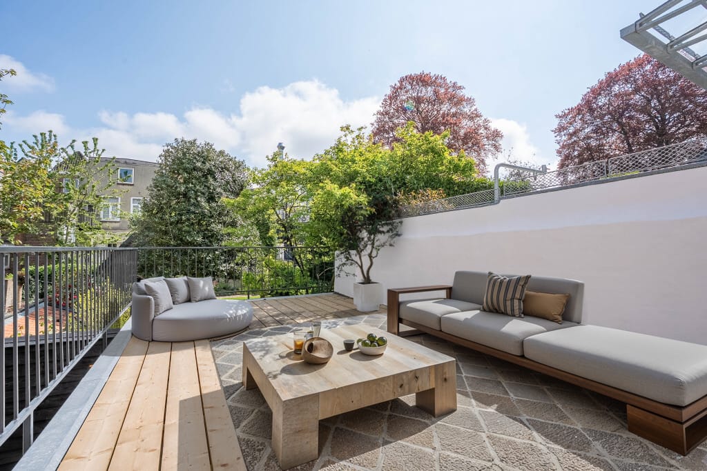 Er zijn twee fijne badkamers – eentje op elke verdieping – met een luxe afwerking en al het nodige sanitair. En dan dat terras: zonnig, ruim, privé maar toch gezellig. Een plek waar je vergeet dat je midden in de stad woont. Tot je weer naar beneden loopt en binnen twee minuten op een terrasje zit, door de winkelstraat loopt of je boodschappen scoort bij de verswinkels om de hoek.