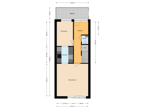 - 19 m² (4,48 meter diep en 4,30 meter breed)