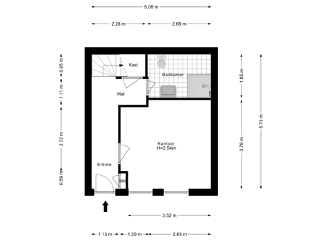 Bij binnenkomst vind je in de hal toegang tot de meterkast, een praktische trapkast (met aansluiting voor de wasmachine), de trap naar boven én de badkamer. Aan de voorzijde ligt een fijne ruimte die je zelf mag invullen: slaapkamer of kantoor.