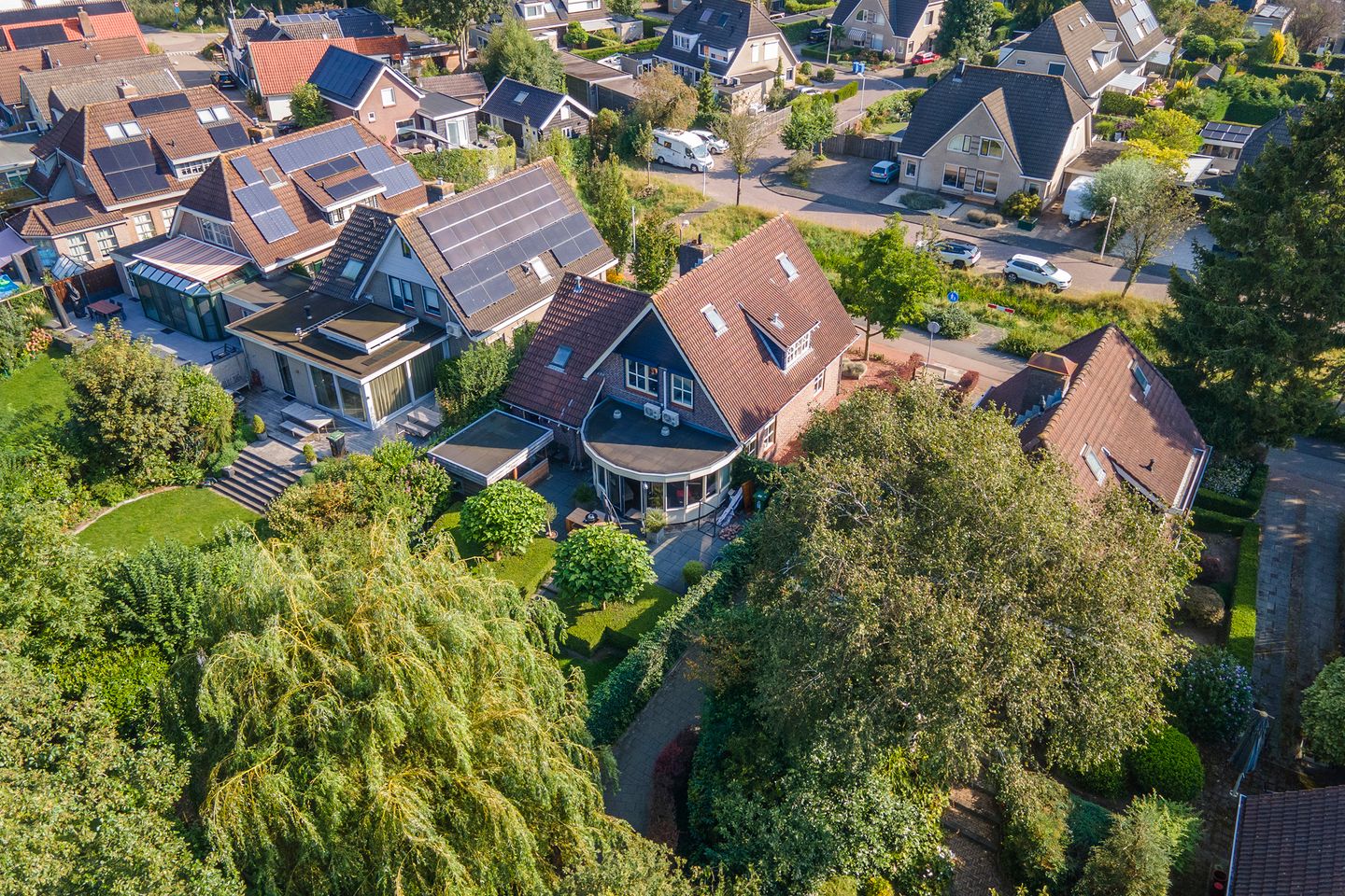 De achtertuin is een echt plaatje! Direct aan de woning bevindt zich een verhoogd terras met een sfeervolle lounge-overkapping en prachtig uitzicht op de lager gelegen, groene tuin. Strakke buxusblokken en een sierlijke haag zorgen voor een fraaie symmetrie, met daarin twee statige bolcatalpa’s als blikvangers. Daarachter strekt zich een ruim, frisgroen gazon uit, omringd door groene hagen en een karaktervolle treurwilg. Voor het opbergen van tuinspullen is er een praktische berging van circa 6 m² aanwezig. Een volwassen, fraai aangelegde tuin die volop privacy en sfeer biedt.