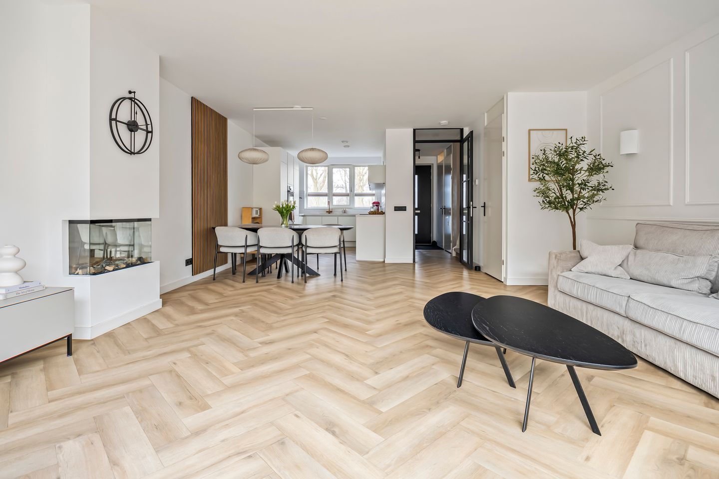 Bij binnenkomst valt direct de ruimte en het licht op. De woonkamer is royaal opgezet en dankzij de grote schuifpui naar de tuin heerlijk licht. In de woonkamer is voldoende ruimte voor een fijn zit- en eethoek, de elektrische haard in het midden zorgt voor warmte en verbondenheid. De schuifdeur maakt de tuin echt onderdeel van de leefruimte: binnen en buiten lopen hier moeiteloos in elkaar over. De open keuken sluit naadloos aan op de woonkamer en is strak en modern uitgevoerd, compleet met alle benodigde inbouwapparatuur én een Quooker. Een fijne plek voor lange diners en gezellige avonden.