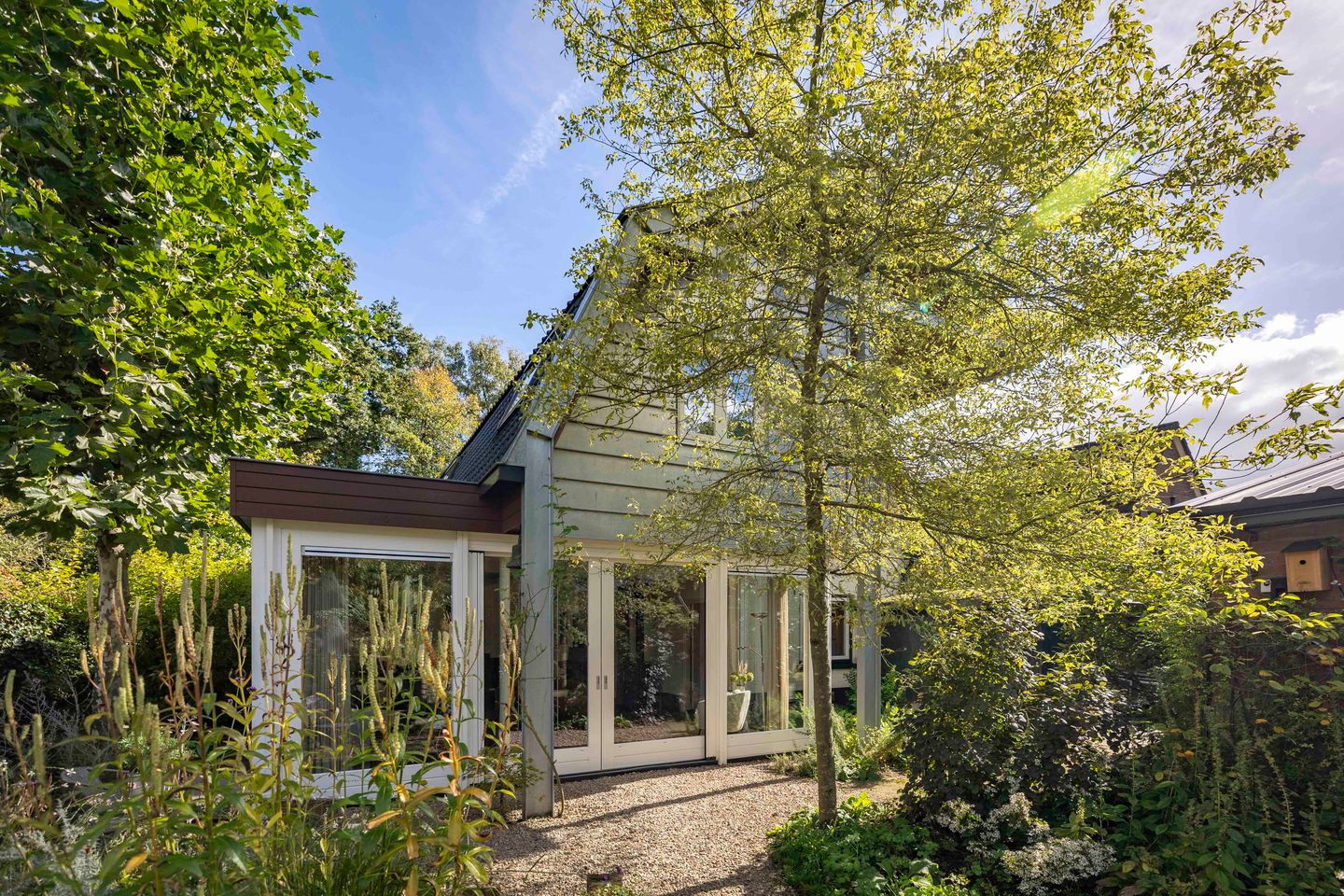 In 1930 werd dit vrijstaande huis gebouwd aan de ventweg langs de Deventerweg in Gorssel. Dat betekent dat het hier al bijna 100 jaar staat, zo binnen de bebouwde kom van het dorp en vlakbij de gezellige Hoofdstraat. De geschiedenis laat haar sporen na en dat geldt ook voor dit uiterst charmante huis. Het huis is ooit bewoond geweest door een groentehandelaar en dat is de verklaring voor de aanwezigheid van een ruim 80 m2 grote garage. Wat zeker ook een stempel op het huis heeft gedrukt is het inschakelen van architectenbureau Ehrenhard door de huidige eigenaars. Ehrenhard is er in geslaagd om het huis op een moderne manier uit te breiden die toch heel goed past bij de jaren 30 stijl. Met materialen zoals staal, zink, hout en glas is het huis aan de tuinkant flink uitgebreid en kan er in de woonkamer volop genoten worden van de weelderige tuin. De tuin is een bijzondere; een driedimensionale aanleg zorgt voor een kleurenpalet dat met de seizoenen mee kleurt. Verscholen terrassen met elk een eigen karakter en functie. Zo is er bijvoorbeeld ook één waar je lekker beschut kunt uitpuffen na het baantjes trekken in je eigen zwembad! Lijkt je dat niet heerlijk, een uiterst beschut gelegen zwembad? Later meer informatie hierover. We gaan nu het huis bekijken.