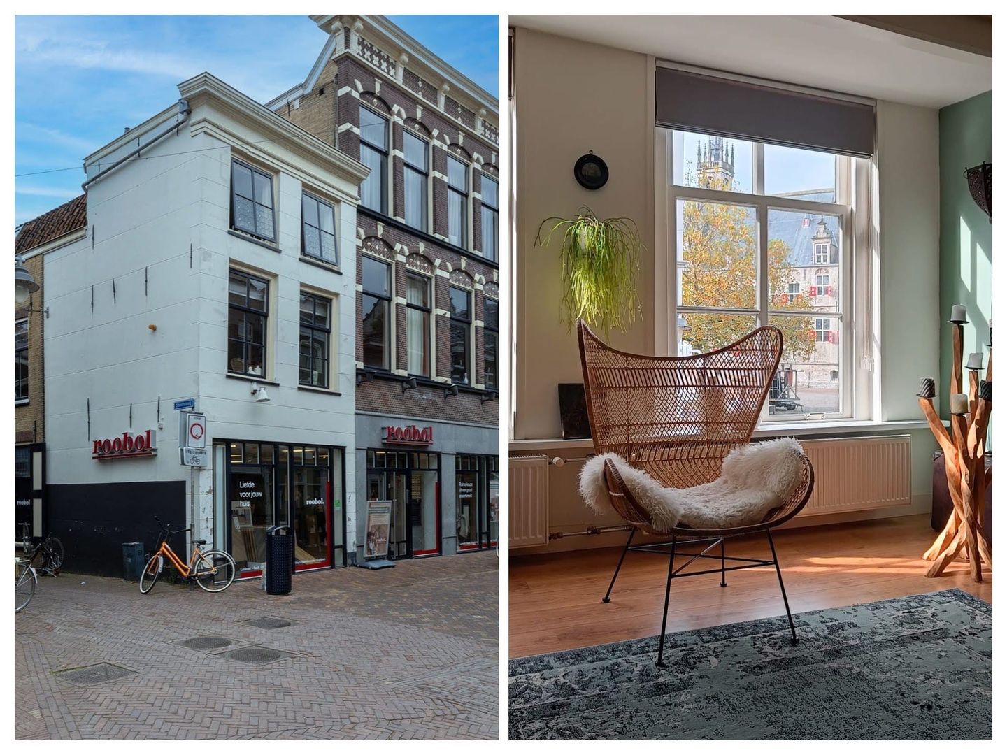 Entree/hal met meterkast, toilet v.v. wandcloset en fonteintje en toegang tot de woonkamer. De living ligt aan de voorzijde, en biedt door de lengte in combinatie met het houten balkenplafond zowel ruimte als sfeer. Vanuit de woonkamer is er een leuk uitzicht op het Marktplein en het oude stadhuis, welke bekendstaat als één van de mooiste monumentale gebouwen van Nederland. Verder is er een open trap met trapkast en loopt de living door in de eethoek in het midden, met daarachter de open keuken. De keuken is uitgerust met een vierpits gaskookplaat, een afzuigkap, een vaatwasser en een koelkast. De gehele verdieping beschikt over een laminaatvloer en gladgestuukte wanden.