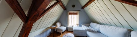 Hier komt u eerst op zolder/tussenkamer met schuifkasten onder de schuine kap. Als u doorloopt komt u in de 2e slaapkamer met twee dakramen, aan iedere zijde één.