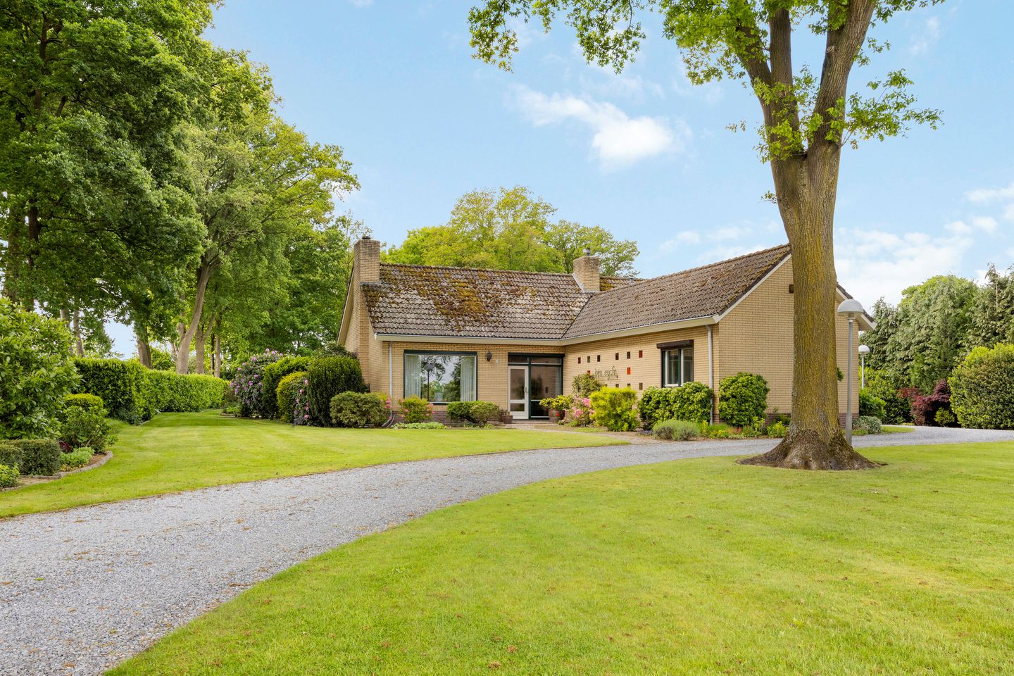 De tuin is ingericht met een hobbykas, gazon, borders en volwassen bomen die zorgen voor optimale privacy. Het achterste gedeelte van het perceel is ingericht als eigen bos, een unieke toevoeging. Via de lange oprijlaan bereik je de royale voortuin en de garages.