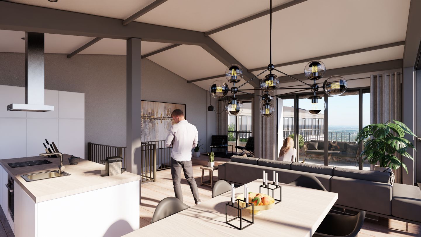 De vijfde verdieping wordt geheel nieuw opgetrokken en heeft een bijzondere Loft-architectuur. De grote, lichte en hoge (> 4.40 m) woonkamer en open keuken gecombineerd met de glazen wanden geven je meteen het gevoel van buiten wonen. De terrassen op de verdiepingen beslaan meer dan 35 m² in totaal.