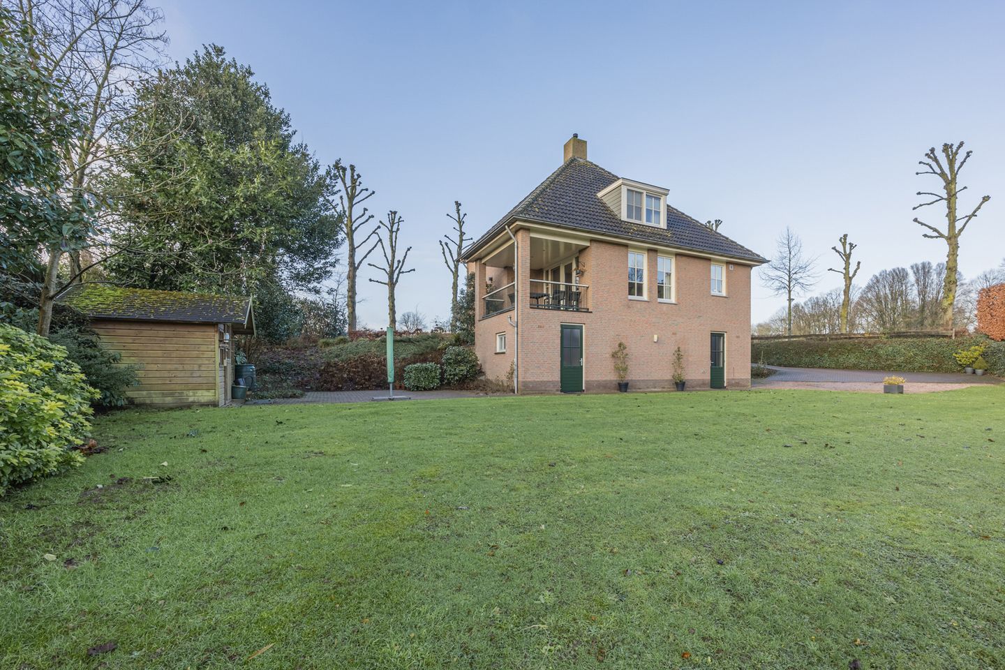 De woning beschikt rondom over een grote tuin met tuinhuis en meerdere terrassen, perfect gelegen voor ultieme privacy. Aan de zijkant van de woning ligt een ruime oprit met parkeergelegenheid voor meerdere auto’s plus toegang tot de inpandige garage.