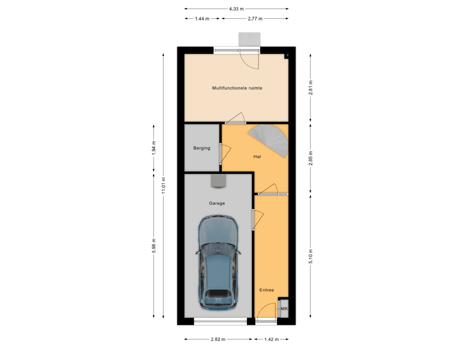 Bij binnenkomst kom je in een lange gang met tegelvloer en meterkast. Vanuit de gang heb je toegang tot de inpandige garage met witgoedaansluitingen en een elektrische deur, een provisiekast en een multifunctionele tuin-/werk-/slaapkamer met toegang tot de achtertuin.