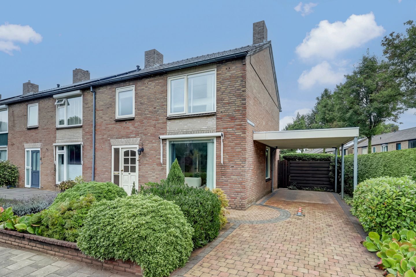 Voortuin met bloemenperk met vaste planten en heesters, de border met lavendel, de fraaie looppaden en de inrit met sierklinkers, de ruime carport met doorgang naar de achtertuin, aan de rechterzijde wederom een mooie border gevuld met vaste planten en heesters, de sfeervolle tuinlamp en een prachtige haag.