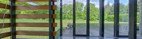 De woonkamer oogt strak en stoer dankzij de gevlinderde betonvloer. Een gezellig zithoek vormt zich rond de houtkachel. Maar het meest bijzondere is het uitzicht aan alle kanten. De spectaculaire glazen pui over de volle breedte en hoogte staat garant voor een wijds uitzicht en geeft toegang tot het hardhouten vlonderterras. Aan de achterzijde is gekozen voor horizontale ramen, als bij een wild-uitkijkpunt.