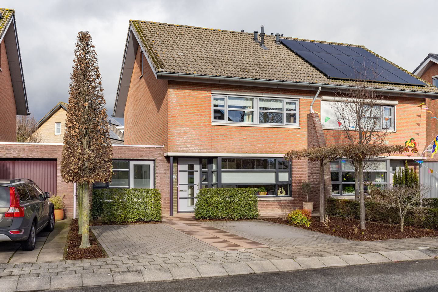Stapvoets draaien we de oprit op waar je gemakkelijk twee auto’s naast elkaar kwijt kan. De deur staat al uitnodigend open als we aan komen lopen. In de hal met garderobe bekijken we kort de meterkast en openen de deur richting woonkamer aan de voorzijde. Het uitzicht door de straat is fraai door de leuke verscheidenheid aan woningen aan weerskanten. De woonkamer is lekker ruim van opzet maar voelt tegelijk ook warm en geborgen aan. Het daglicht valt prettig binnen en zorgt samen met de indeling voor een uitnodigende sfeer. Een fijne plek waar je moeiteloos een comfortabele bank kwijt kunt om je ’s avonds heerlijk in te nestelen met een goed boek of een mooie film.