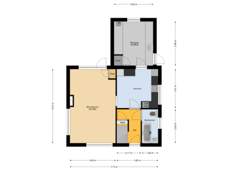 Vanuit de keuken is de entree/hal bereikbaar, hier is ook de badkamer.