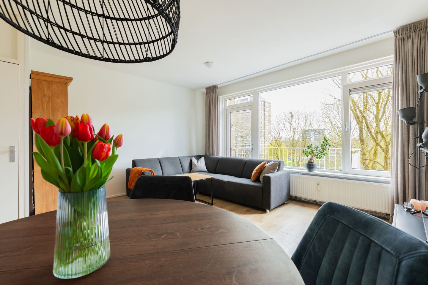 Entree, hal met toilet en praktische kast met wasmachineaansluiting; nette keuken voorzien van diverse (deels ter overname) inbouwapparatuur, waaronder een inductiekookplaat, oven, vaatwasser en koel-vriescombinatie; lichte woonkamer met trapkast en toegang tot het zonnige balkon met vrij uitzicht over het groen.