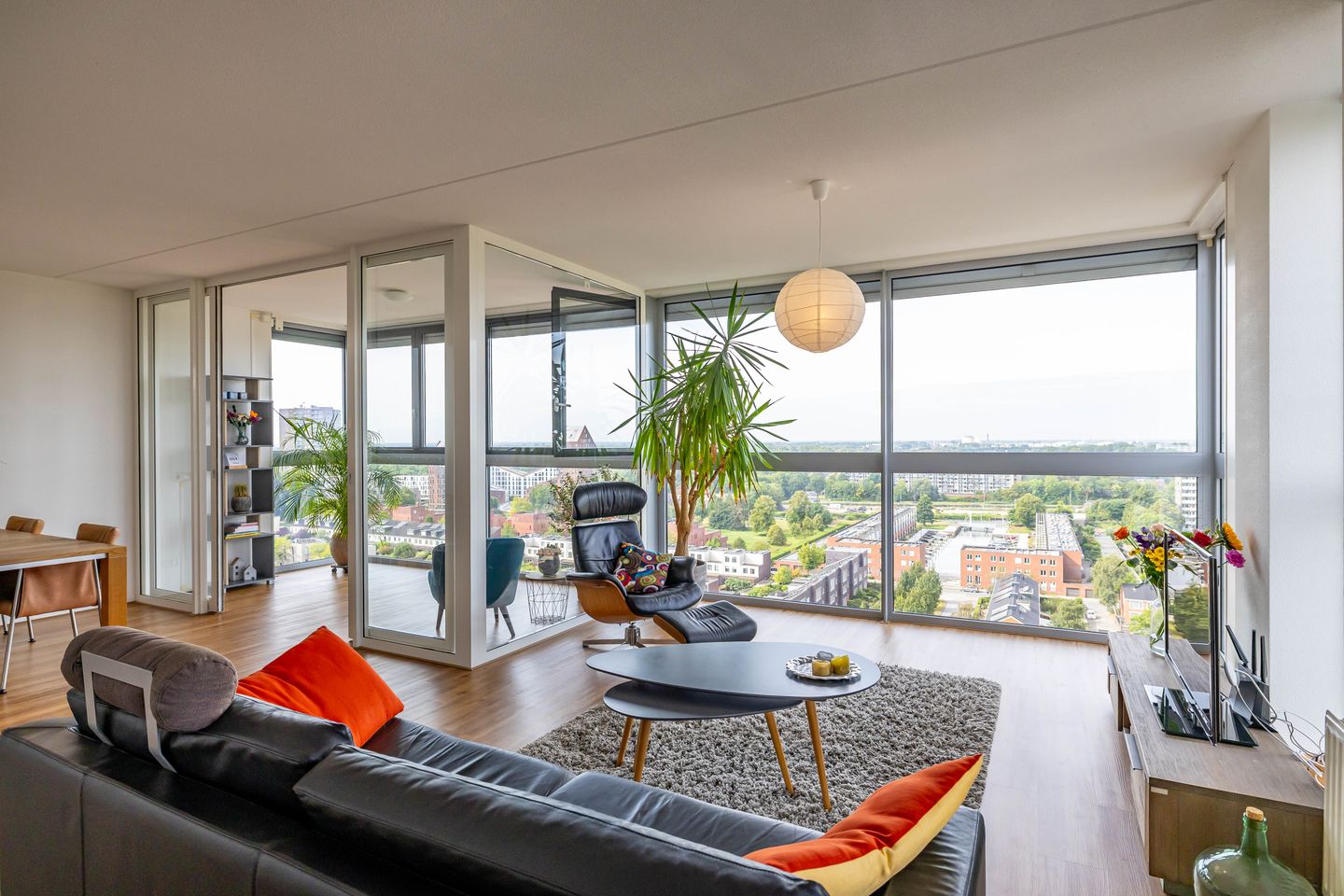 De lift geeft toegang tot alle verdiepingen van het complex, het appartement zelf bevindt zich op de dertiende verdieping. Je komt binnen in een grote hal, deze geeft toegang tot alle ruimtes van het appartement. De royale woonkamer met open keuken van in totaal ca. 50 m² biedt volop ruimte en beschikt over zeer veel lichtinval door de gunstige ligging op het zuidwesten. Via de schuifpui is de serre bereikbaar, een heerlijke plek om te genieten van het prachtige panoramische uitzicht over de stad. De keuken is uitgerust met diverse inbouwapparatuur zoals een kookplaat, afzuigkap, combi oven, koelkast en vaatwasser. De woning beschikt verder over twee fijne slaapkamers van ca. 15 en 11 m² die door de ligging op het noorden het hele jaar door aangenaam koel zijn. De badkamer is voorzien van een ligbad, douche en wastafel. Als laatste is er een toiletruimte met fonteintje aanwezig en een handige wasruimte / berging, hier bevindt zich ook de aansluiting voor de wasmachine.