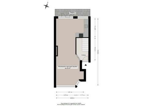 entree, hal, trapkast, doorzonkamer met een open keuken ca. 33m2 met een nette keukeninrichting en openslaande deuren naar balkon.