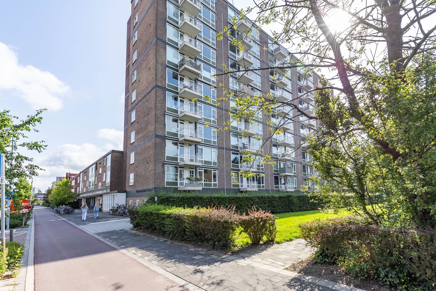Entree en vervolgens een ruime hal met provisiekast, toilet met fonteintje, keuken voorzien van combi oven/magnetron, inductiekookplaat, koelkast, vaatwasser, wasmachine én heetwaterkraan, nette badkamer voorzien van douchecabine, ruime en lichte woonkamer van circa 35m² met toegang tot het balkon gelegen op het westen. De eerste slaapkamer is toegankelijk vanuit de woonkamer, een tweede slaap-/studeerkamer met ruime inbouwkast is toegankelijk vanuit de hal.