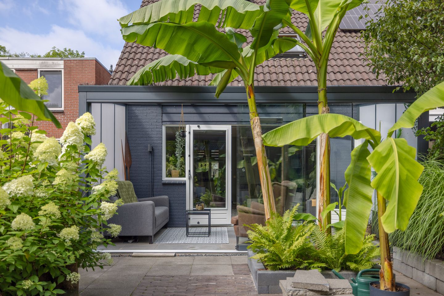 Fraai aangelegde tuin met zon