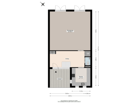 Eigen oprit geschikt voor een grote auto + een kleine auto, entree met fraaie glas pui, ruime hal, meterkast inclusief glasvezel aansluiting, modern toilet met wastafeltje, bergkast. Keuken aan de straatzijde. De keuken in U-vormige opstelling met inductiekookplaat, rvs-afzuiging, 1,2 spoelbak, combi magnetron/oven, stoomoven, koelkast, vriezer en vaatwasser.