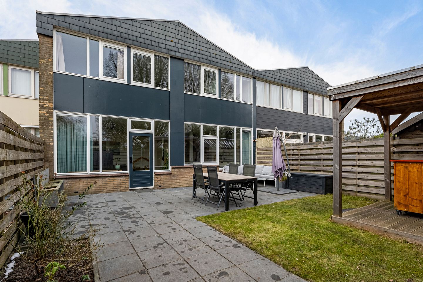 De verzorgde en onderhoudsvriendelijke achtertuin ligt heerlijk zonnig, beschikt over een terras, praktische tuinoverkapping en een handige en brede achterom, wat het extra gebruiksvriendelijk maakt.