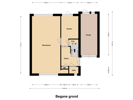 Bij binnenkomst komt u in de hal, voorzien van een tegelvloer en strak gestucte wanden. Vanuit de hal heeft u toegang tot het toilet, de meterkast, de keuken en de trapopgang naar de eerste verdieping.