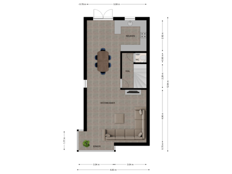 De woonkamer met open keuken is groot ca. 59 m² en is voorzien van een grote erker, een tegelvloer en vloerverwarming.
